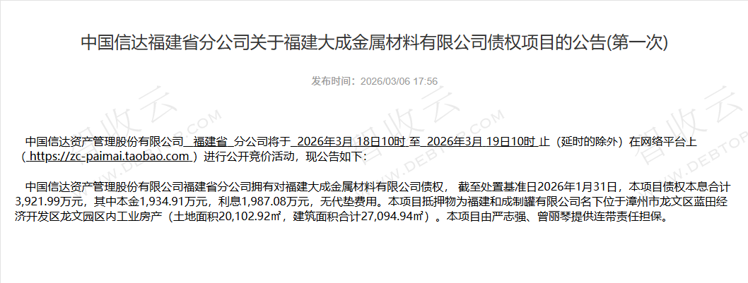 福建大成金属材料有限公司,福建和成制罐有限公司,中国信达福建省分公司关于福建大成金属材料有限公司债权项目的公告(第一次),公告日期:2026-03-06,债权方:中国信达资产管理股份有限公司福建省分公司,资产总额:3922.0万元。