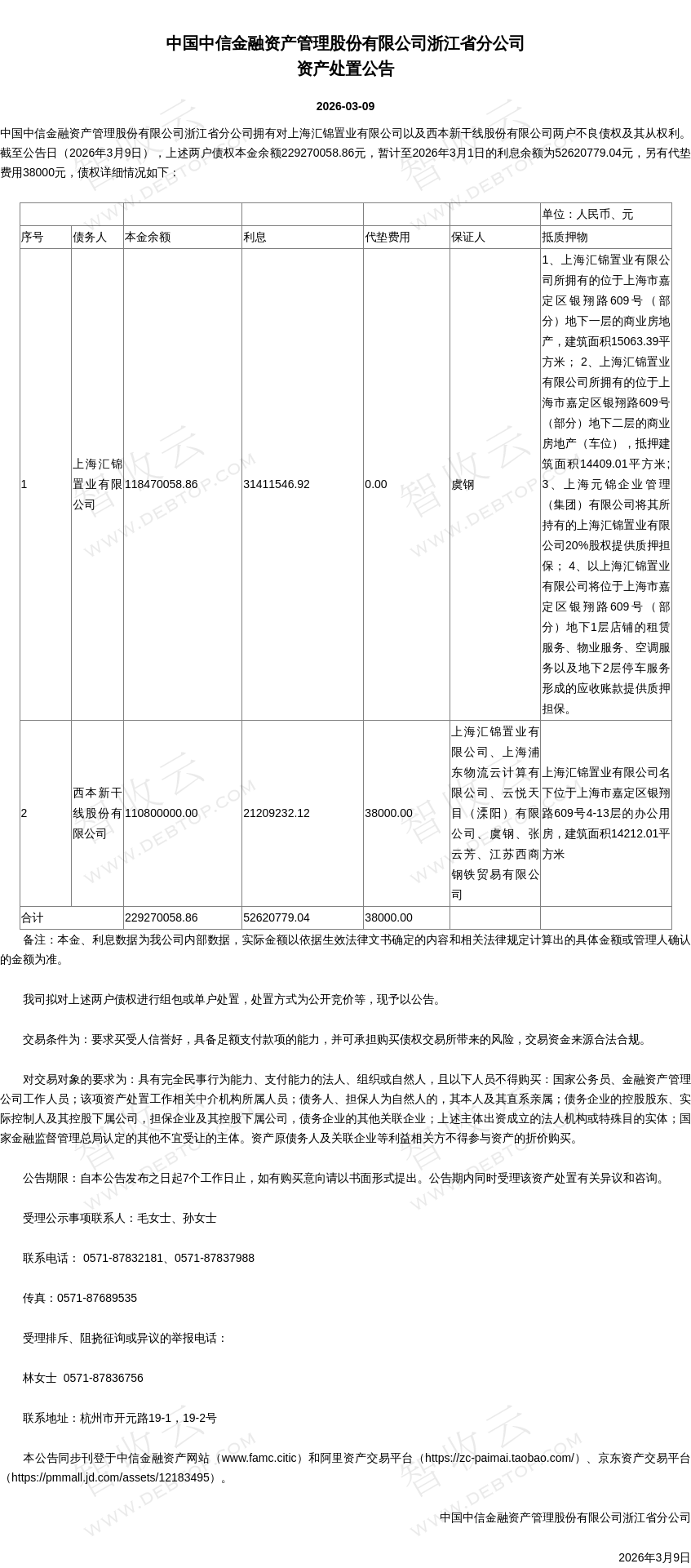 上海汇锦置业有限公司,西本新干线股份有限公司,中国中信金融资产管理股份有限公司浙江省分公司资产处置公告,公告日期:2026-03-09,债权方:中国中信金融资产管理股份有限公司浙江省分公司,资产总额:28192.9万元。