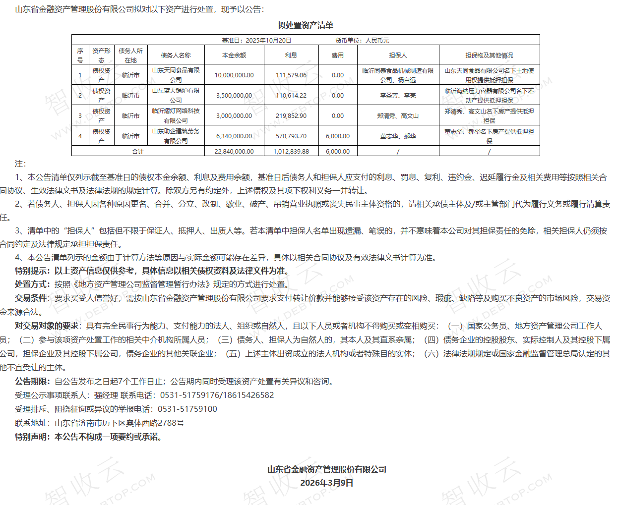 山东蓝天锅炉有限公司,临沂熠灯网络科技有限公司,山东省金融资产管理股份有限公司对山东天同食品有限公司等4户债权资产处置公告,公告日期:2026-03-09,债权方:山东省金融资产管理股份有限公司,资产总额:2385.9万元。