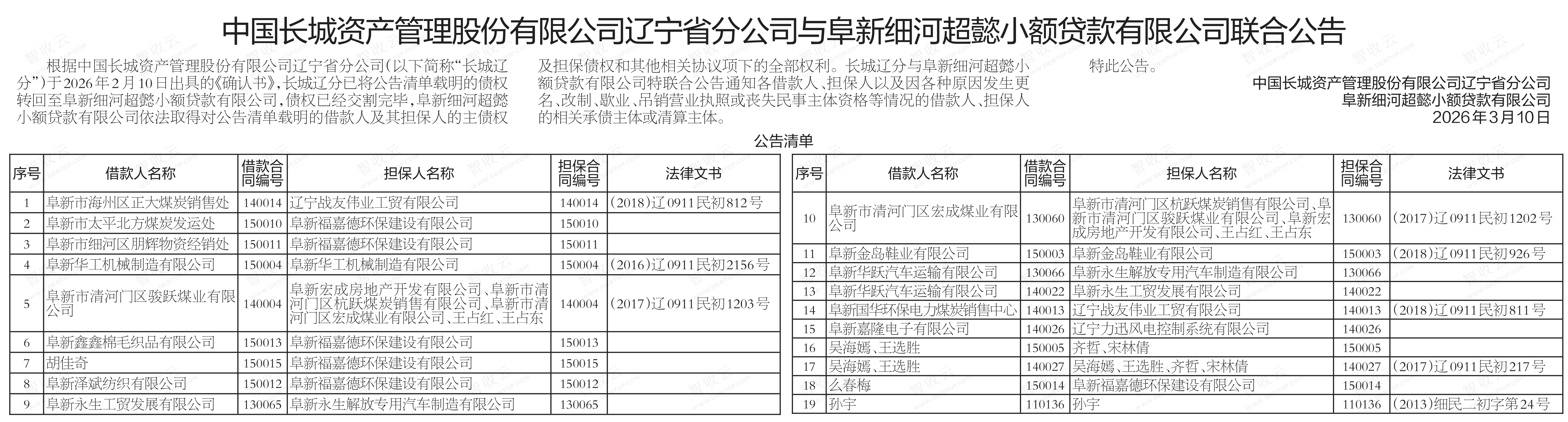 ,中国长城资产管理股份有限公司辽宁省分公司与阜新细河超懿小额贷款有限公司联合公告,公告日期:2026-03-10,转让方:中国长城资产管理股份有限公司辽宁省分公司,受让方:阜新细河超懿小额贷款有限公司,资产总额:0.0万元。