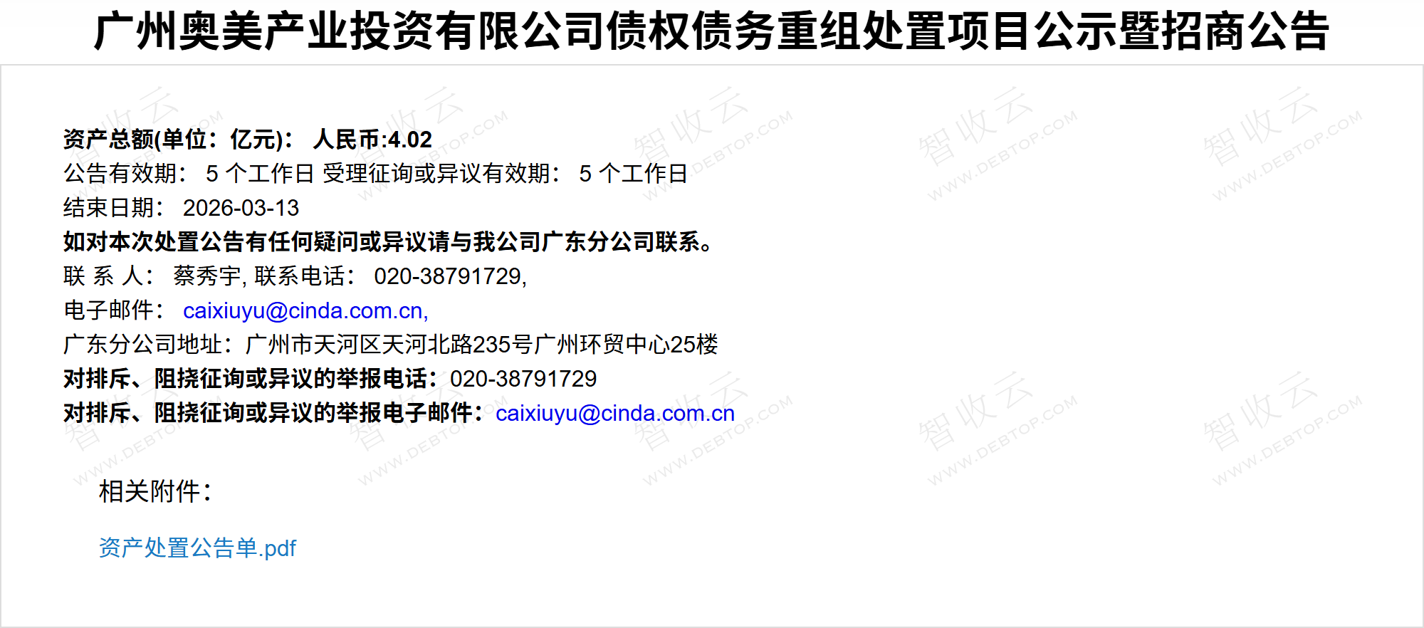 广州奥美产业投资有限公司债权债务重组处置项目公示暨招商公告