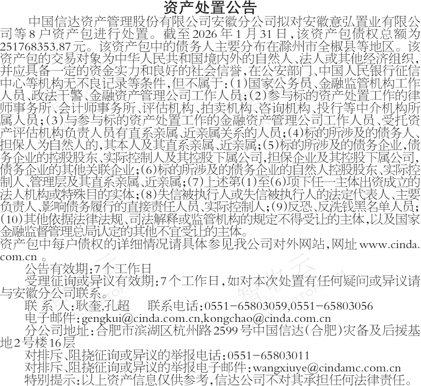 安徽意弘置业有限公司,资产处置公告,公告日期:2026-03-10,债权方:中国信达资产管理股份有限公司安徽分公司,资产总额:25176.8万元。
