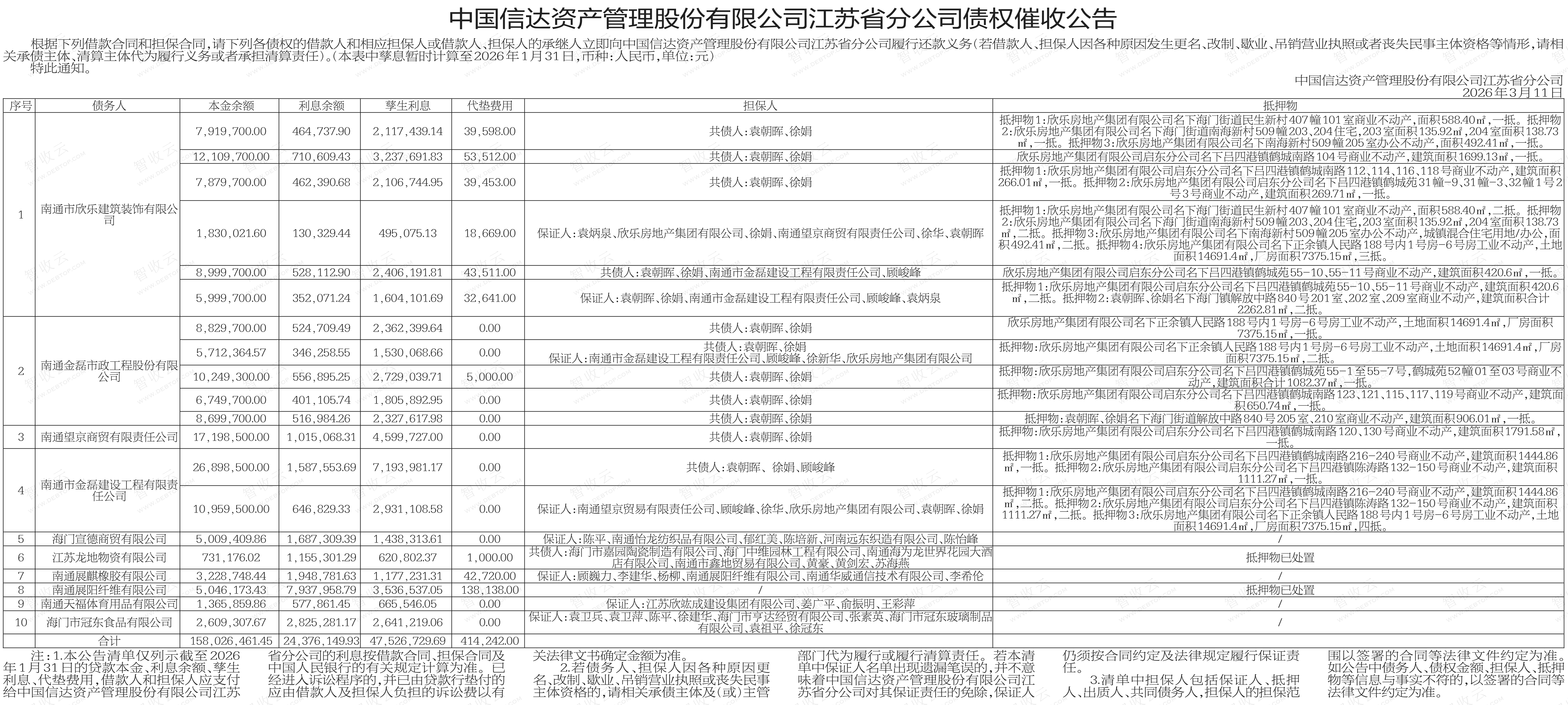 江苏龙地物资有限公司,南通天福体育用品有限公司,中国信达资产管理股份有限公司江苏省分公司债权催收公告,公告日期:2026-03-11,债权方:中国信达资产管理股份有限公司江苏省分公司,资产总额:23034.4万元。