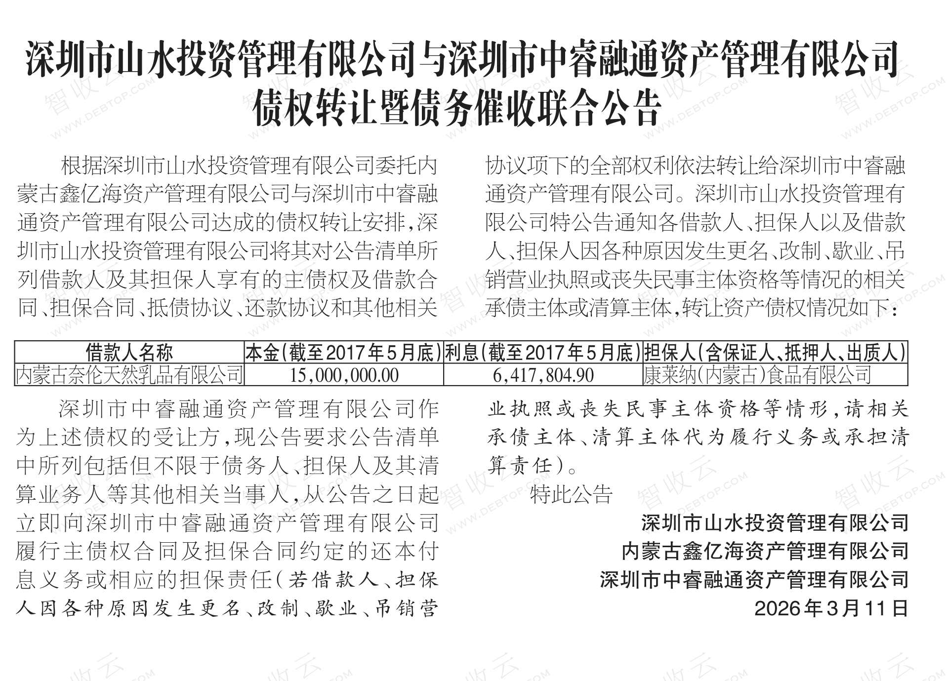内蒙古奈伦天然乳品有限公司深圳市山水投资管理有限公司与深圳市中睿融通资产管理有限公司债权转让暨债务催收联合公告