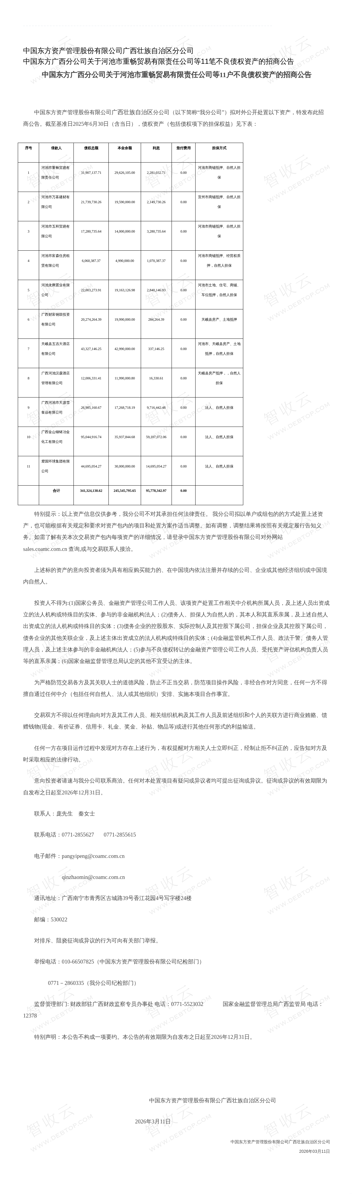 广西金山铟锗冶金化工有限公司,广西财富铜鼓投资有限公司,中国东方资产管理股份有限公司广西壮族自治区分公司中国东方广西分公司关于河池市重畅贸易有限责任公司等11笔不良债权资产的招商公告,公告日期:2026-03-11,债权方:中国东方资产管理股份有限公司广西壮族自治区分公司,资产总额:34132.4万元。