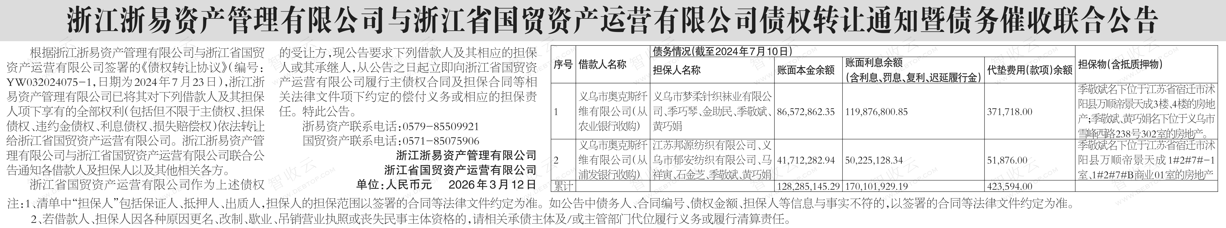 义乌市奥克斯纤维有限公司,江苏邦源纺织有限公司,浙江浙易资产管理有限公司与浙江省国贸资产运营有限公司债权转让通知暨债务催收联合公告,公告日期:2026-03-12,转让方:浙江浙易资产管理有限公司,受让方:浙江省国贸资产运营有限公司,资产总额:29881.1万元。