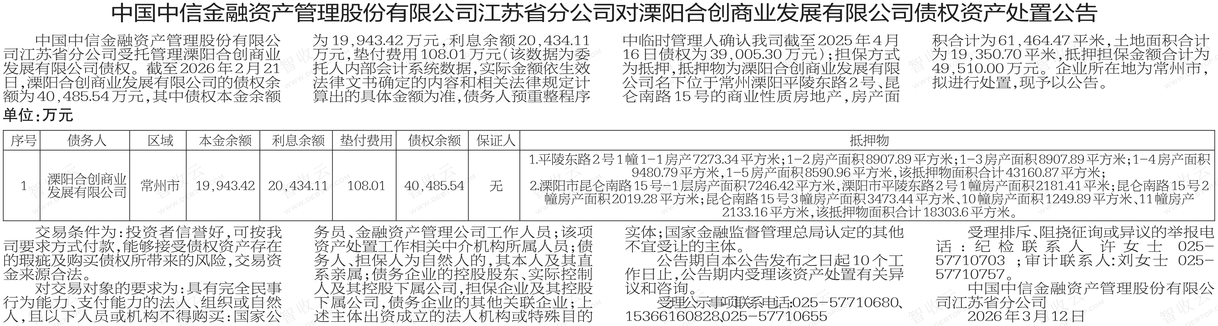 溧阳合创商业发展有限公司,中国中信金融资产管理股份有限公司江苏省分公司对溧阳合创商业发展有限公司债权资产处置公告,公告日期:2026-03-12,债权方:中国中信金融资产管理股份有限公司江苏省分公司,资产总额:40485.5万元。