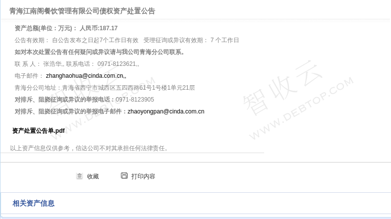 青海江南阁餐饮管理有限公司青海江南阁餐饮管理有限公司债权资产处置公告