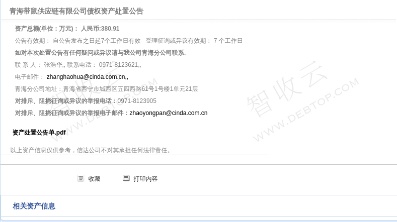 青海带鼠供应链有限公司,青海带鼠供应链有限公司债权资产处置公告,公告日期:2026-03-12,债权方:中国信达资产管理股份有限公司青海分公司,资产总额:380.9万元。