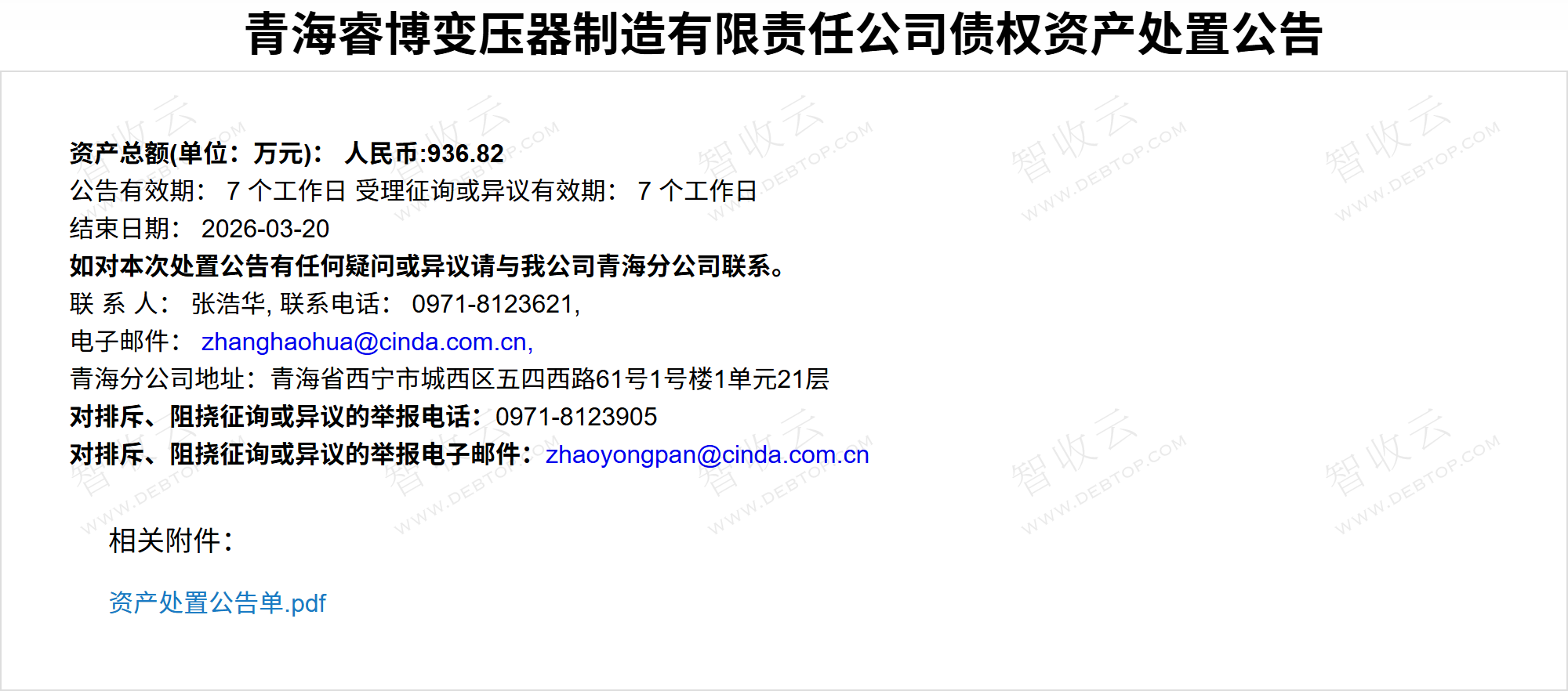 青海睿博变压器制造有限责任公司,青海睿博变压器制造有限责任公司债权资产处置公告,公告日期:2026-03-12,债权方:中国信达资产管理股份有限公司青海分公司,资产总额:936.8万元。