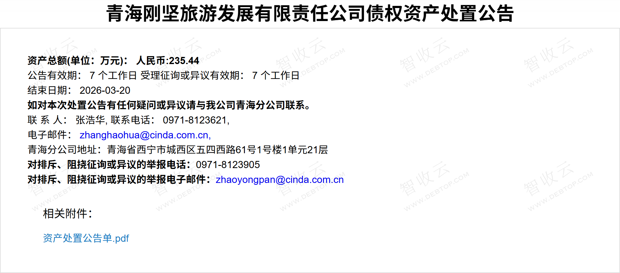 青海刚坚旅游发展有限责任公司,海南州锦青城镇开发建设有限责任公司,青海刚坚旅游发展有限责任公司债权资产处置公告,公告日期:2026-03-12,债权方:中国信达资产管理股份有限公司青海分公司,资产总额:235.4万元。