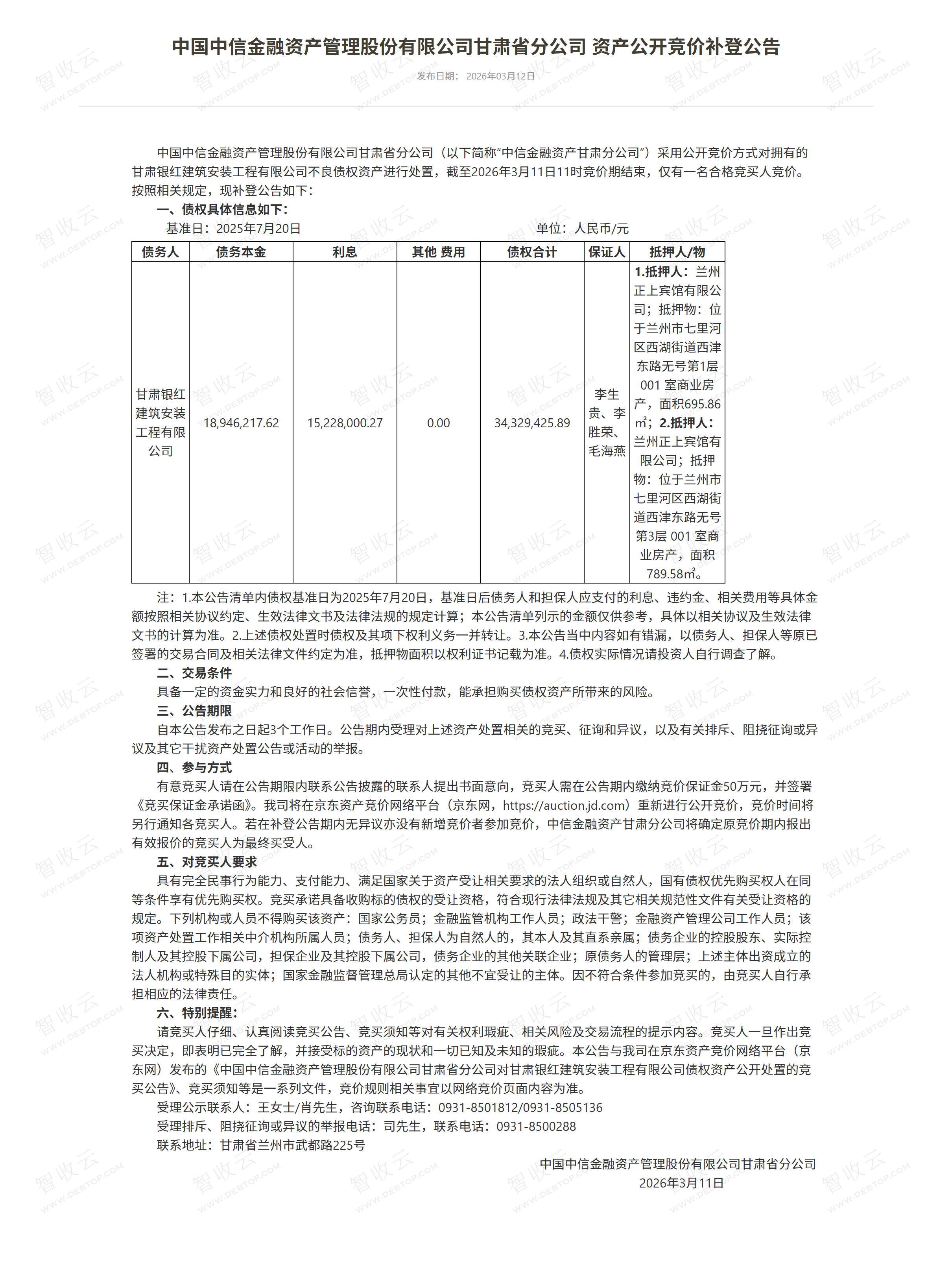 甘肃银红建筑安装工程有限公司,兰州正上宾馆有限公司,中国中信金融资产管理股份有限公司甘肃省分公司资产公开竞价补登公告,公告日期:2026-03-12,债权方:中国中信金融资产管理股份有限公司甘肃省分公司,资产总额:3432.9万元。