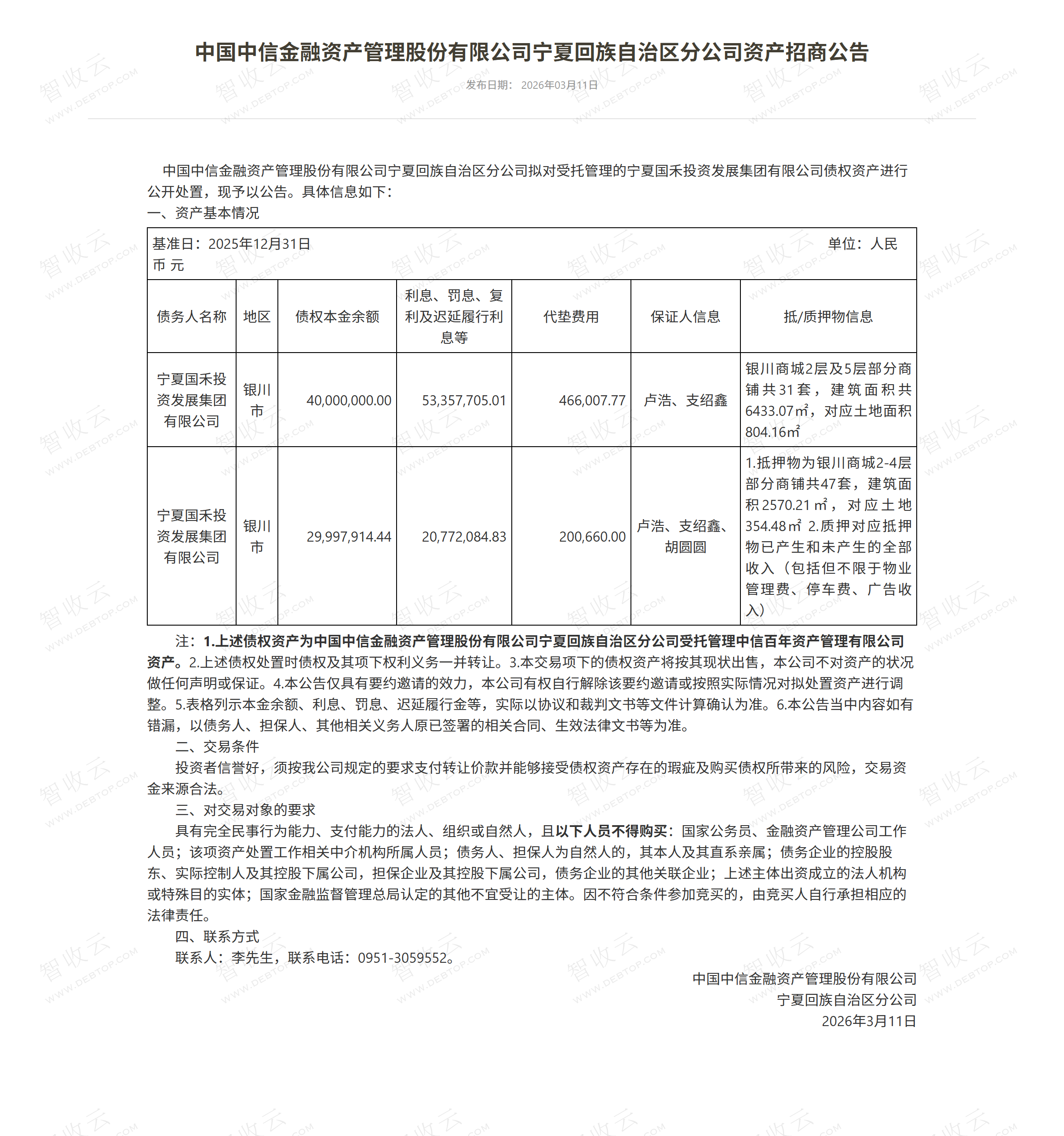 宁夏国禾投资发展集团有限公司,中国中信金融资产管理股份有限公司宁夏回族自治区分公司资产招商公告,公告日期:2026-03-11,债权方:中国中信金融资产管理股份有限公司宁夏回族自治区分公司,资产总额:14479.4万元。