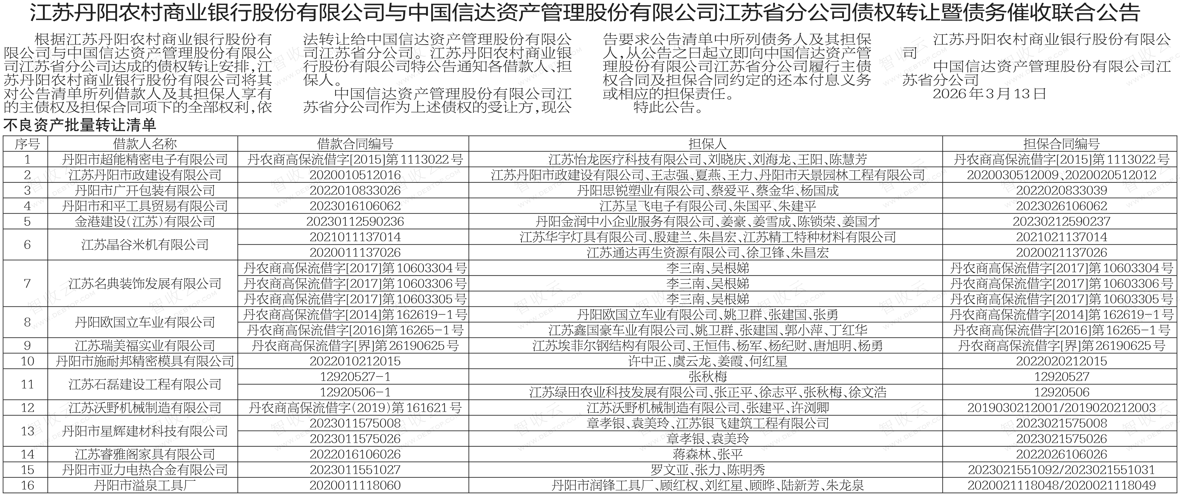 江苏晶谷米机有限公司,江苏名典装饰发展有限公司,江苏丹阳农村商业银行股份有限公司与中国信达资产管理股份有限公司江苏省分公司债权转让暨债务催收联合公告,公告日期:2026-03-13,转让方:江苏丹阳农村商业银行股份有限公司,受让方:中国信达资产管理股份有限公司江苏省分公司,资产总额:0.0万元。