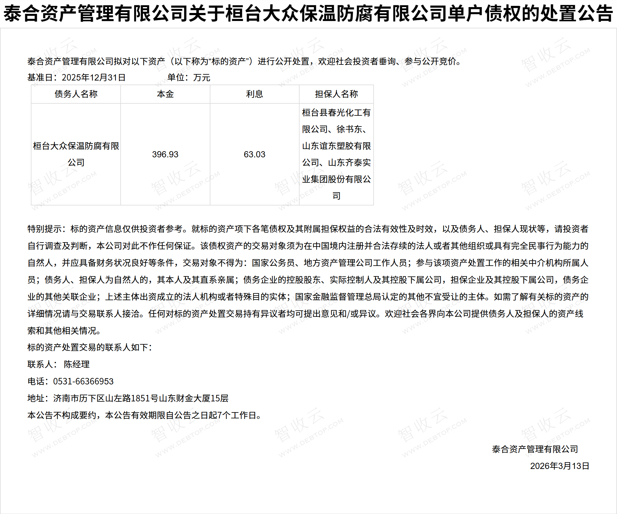 桓台大众保温防腐有限公司泰合资产管理有限公司关于桓台大众保温防腐有限公司单户债权的处置公告