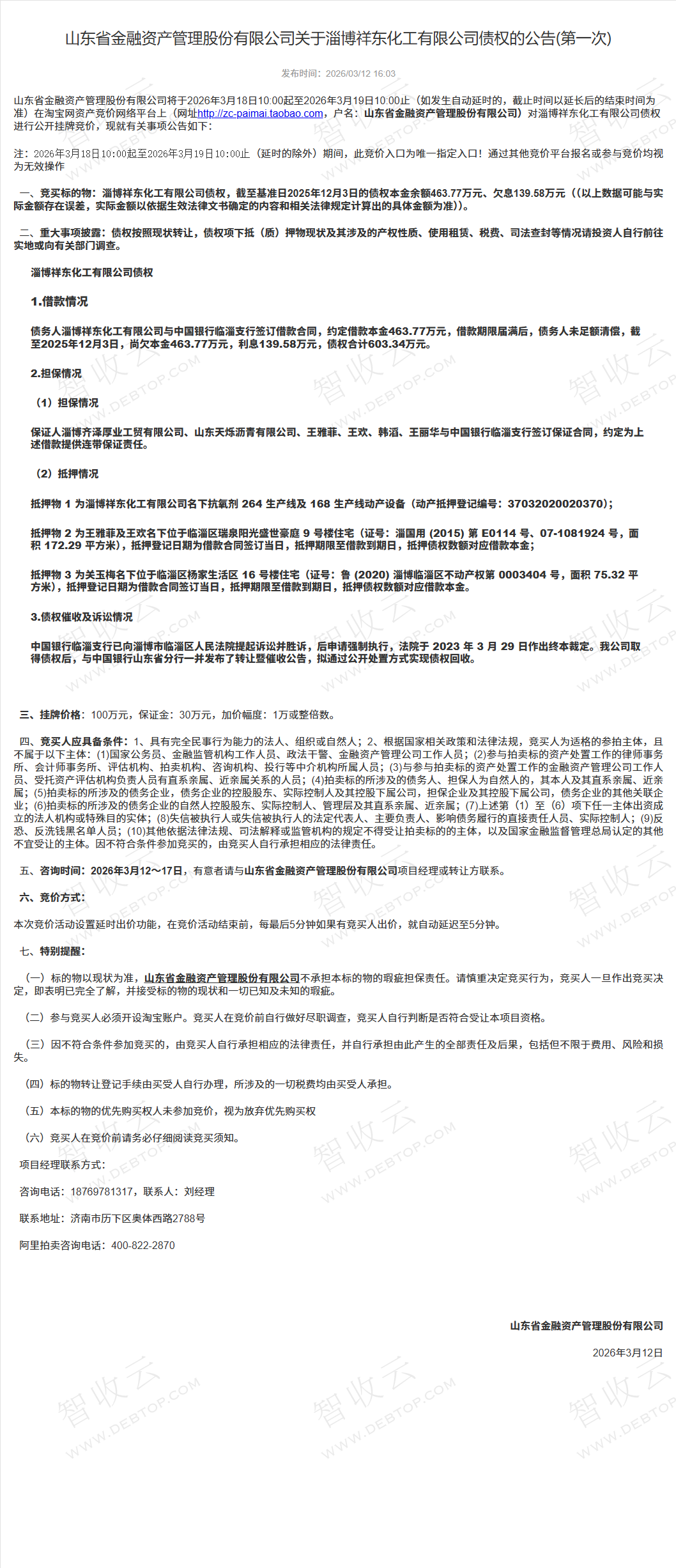 淄博祥东化工有限公司,淄博齐泽厚业工贸有限公司,山东省金融资产管理股份有限公司关于淄博祥东化工有限公司债权的公告(第一次),公告日期:2026-03-12,债权方:山东省金融资产管理股份有限公司,资产总额:603.3万元。