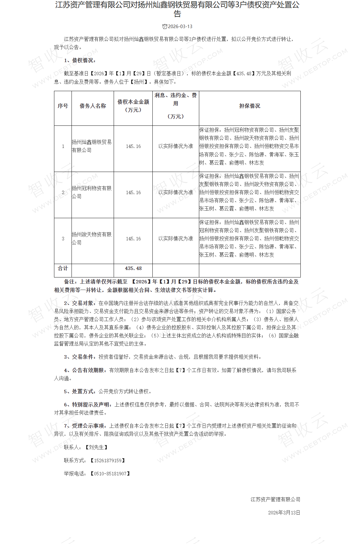 扬州冠利物资有限公司,扬州竣天物资有限公司,江苏资产管理有限公司对扬州灿鑫钢铁贸易有限公司等3户债权资产处置公告,公告日期:2026-03-13,债权方:江苏资产管理有限公司,资产总额:435.5万元。