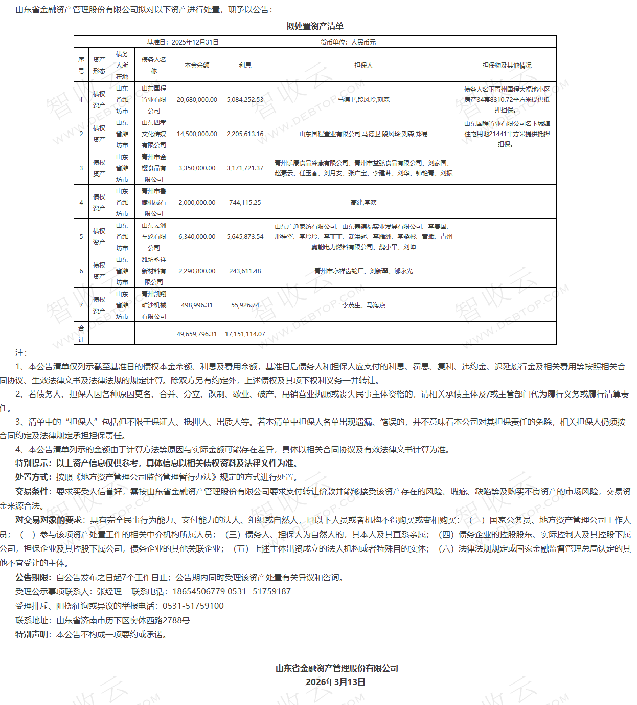 青州市金樱食品有限公司,山东云洲车轮有限公司,山东省金融资产管理股份有限公司对山东国程置业有限公司等7户债权资产处置公告,公告日期:2026-03-13,债权方:山东省金融资产管理股份有限公司,资产总额:6681.1万元。