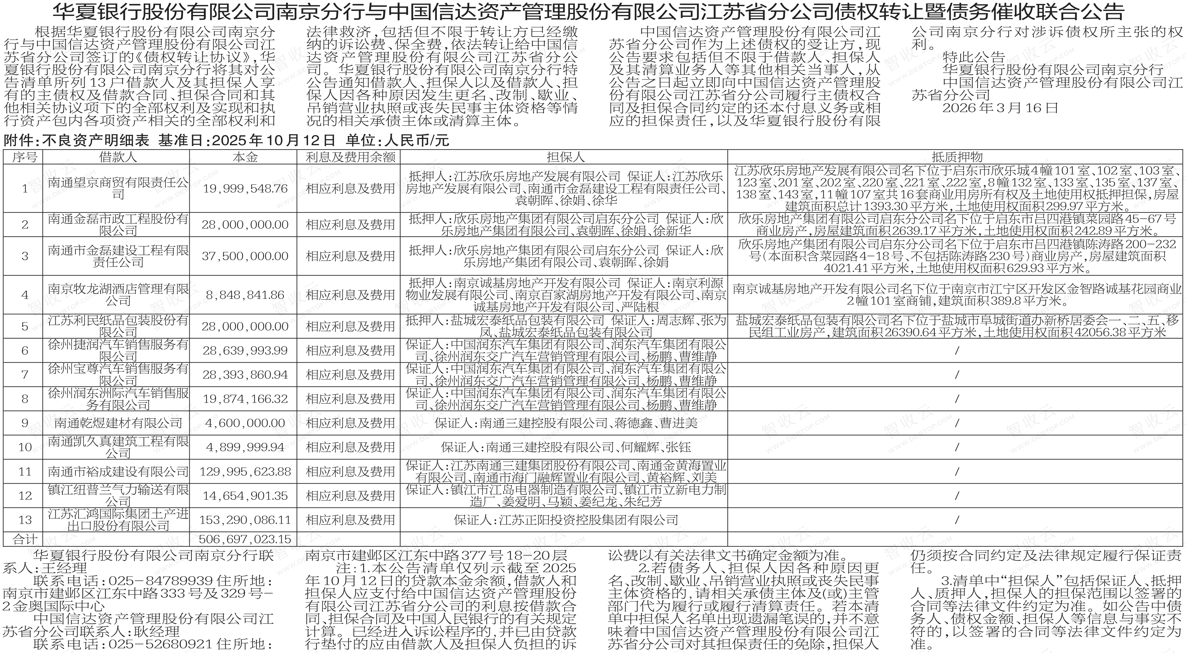 南京牧龙湖酒店管理有限公司,南通市金磊建设工程有限责任公司,华夏银行股份有限公司南京分行与中国信达资产管理股份有限公司江苏省分公司债权转让暨债务催收联合公告,公告日期:2026-03-16,转让方:华夏银行股份有限公司南京分行,受让方:中国信达资产管理股份有限公司江苏省分公司,资产总额:50669.7万元。