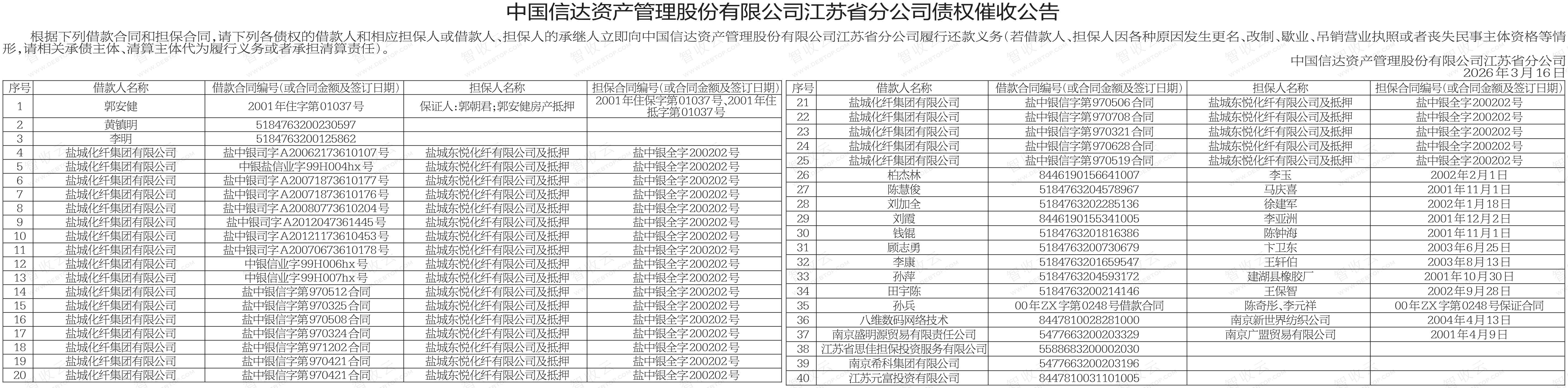 催收公告南京希科集团有限公司,盐城化纤集团有限公司中国信达资产管理股份有限公司江苏省分公司债权催收公告 南京希科集团有限公司,盐城化纤集团有限公司,中国信达资产管理股份有限公司江苏省分公司债权催收公告,公告日期:2026-03-16,债权方:中国信达资产管理股份有限公司江苏省分公司,资产总额:0.0万元。郭安健,柏杰林,李康等40户。来源:江南时报 公告日期:2026-03-16债权金额债权本金户数40户所涉债务企业南京希科集团有限公司盐城化纤集团有限公司南京盛明源贸易有限责任公司江苏元富投资有限公司江苏省思佳担保投资服务有限公司建湖县橡胶厂盐城东悦化纤有限公司南京新世界纺织公司南京广盟贸易有限公司