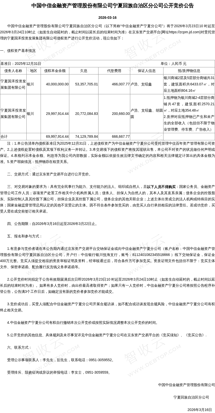 宁夏国禾投资发展集团有限公司,中国中信金融资产管理股份有限公司宁夏回族自治区分公司公开竞价公告,公告日期:2026-03-16,债权方:中国中信金融资产管理股份有限公司宁夏回族自治区分公司,资产总额:14479.4万元。