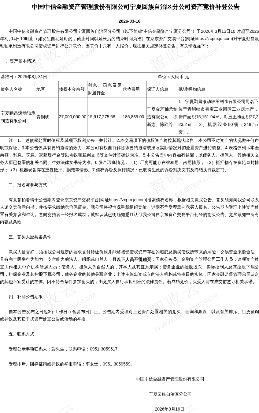 宁夏勤昌滚动轴承制造有限公司,宁夏金环轴承制造有限公司,中国中信金融资产管理股份有限公司宁夏回族自治区分公司资产竞价补登公告,公告日期:2026-03-16,债权方:中国中信金融资产管理股份有限公司宁夏回族自治区分公司,资产总额:4310.4万元。