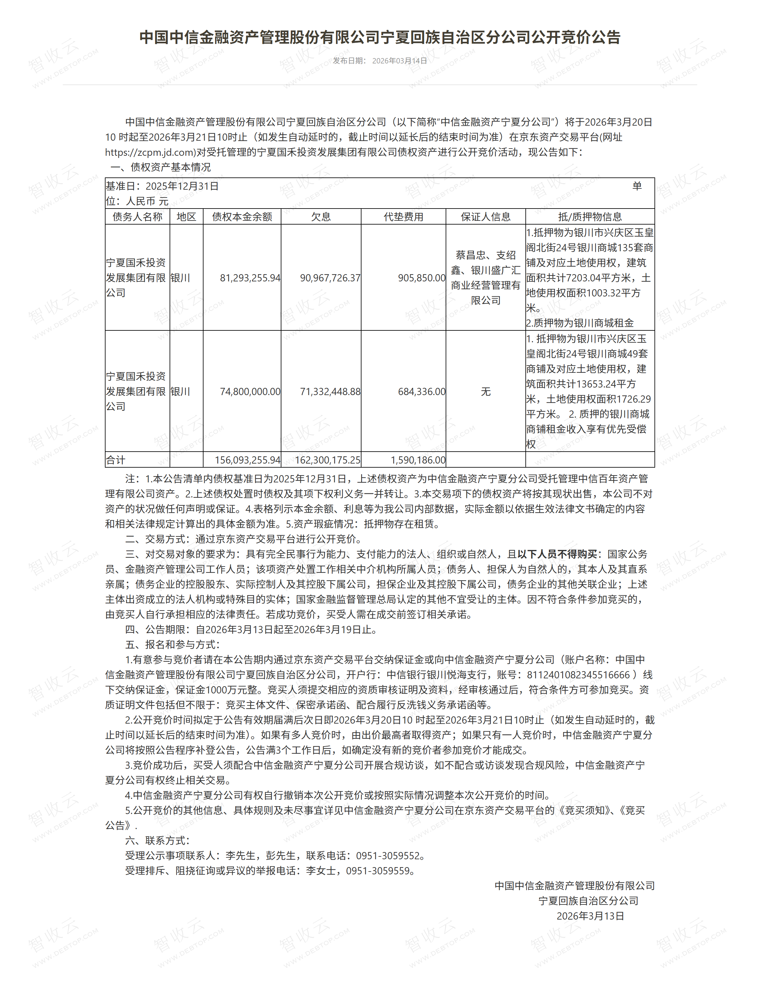 来源:中国中信金融资产管理股份有限公司宁夏回族自治区分公司(京东资产) 公告日期:2026-03-14