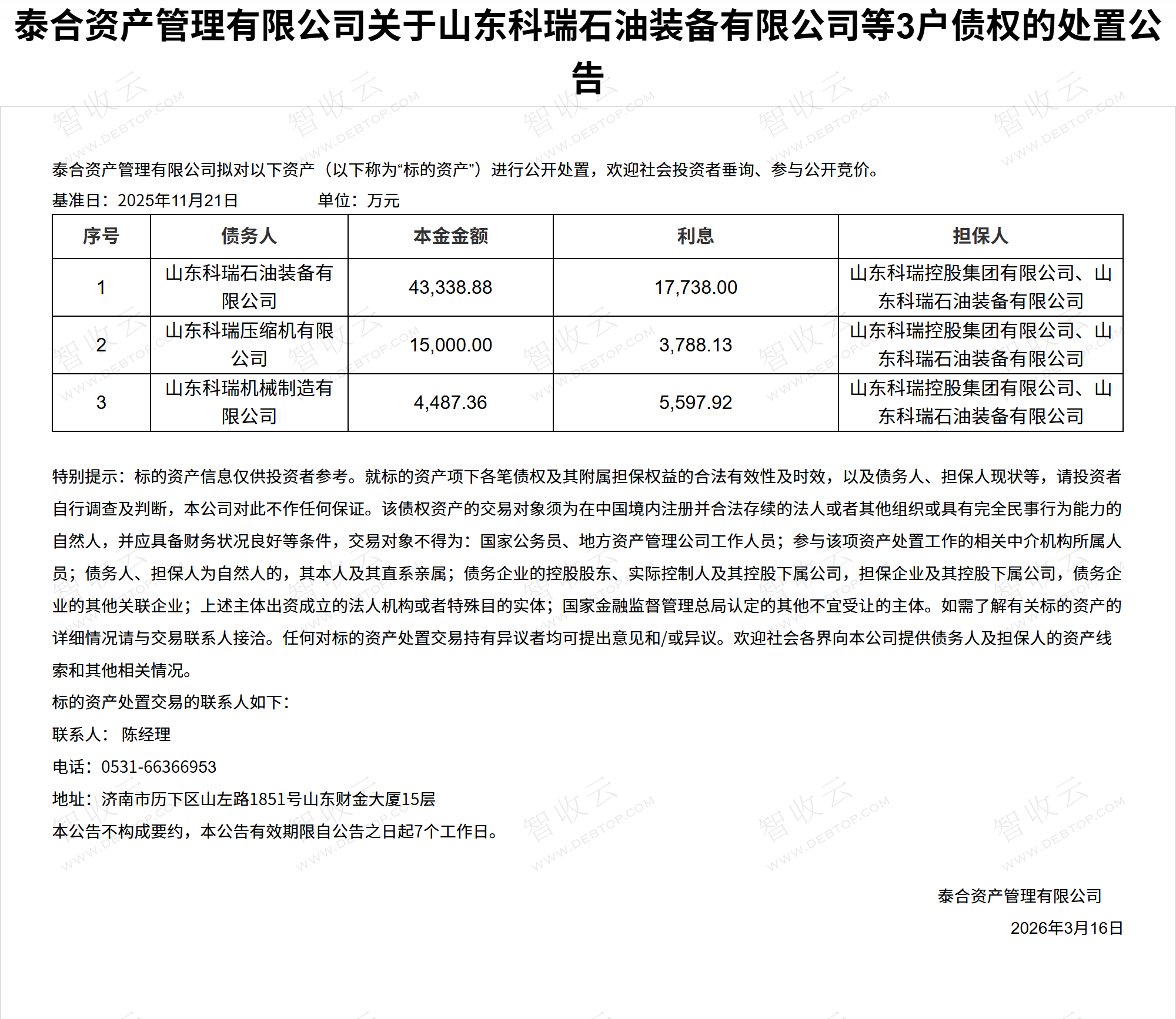 山东科瑞机械制造有限公司,山东科瑞石油装备有限公司,泰合资产管理有限公司关于山东科瑞石油装备有限公司等3户债权的处置公告,公告日期:2026-03-16,债权方:泰合资产管理有限公司,资产总额:89950.3万元。