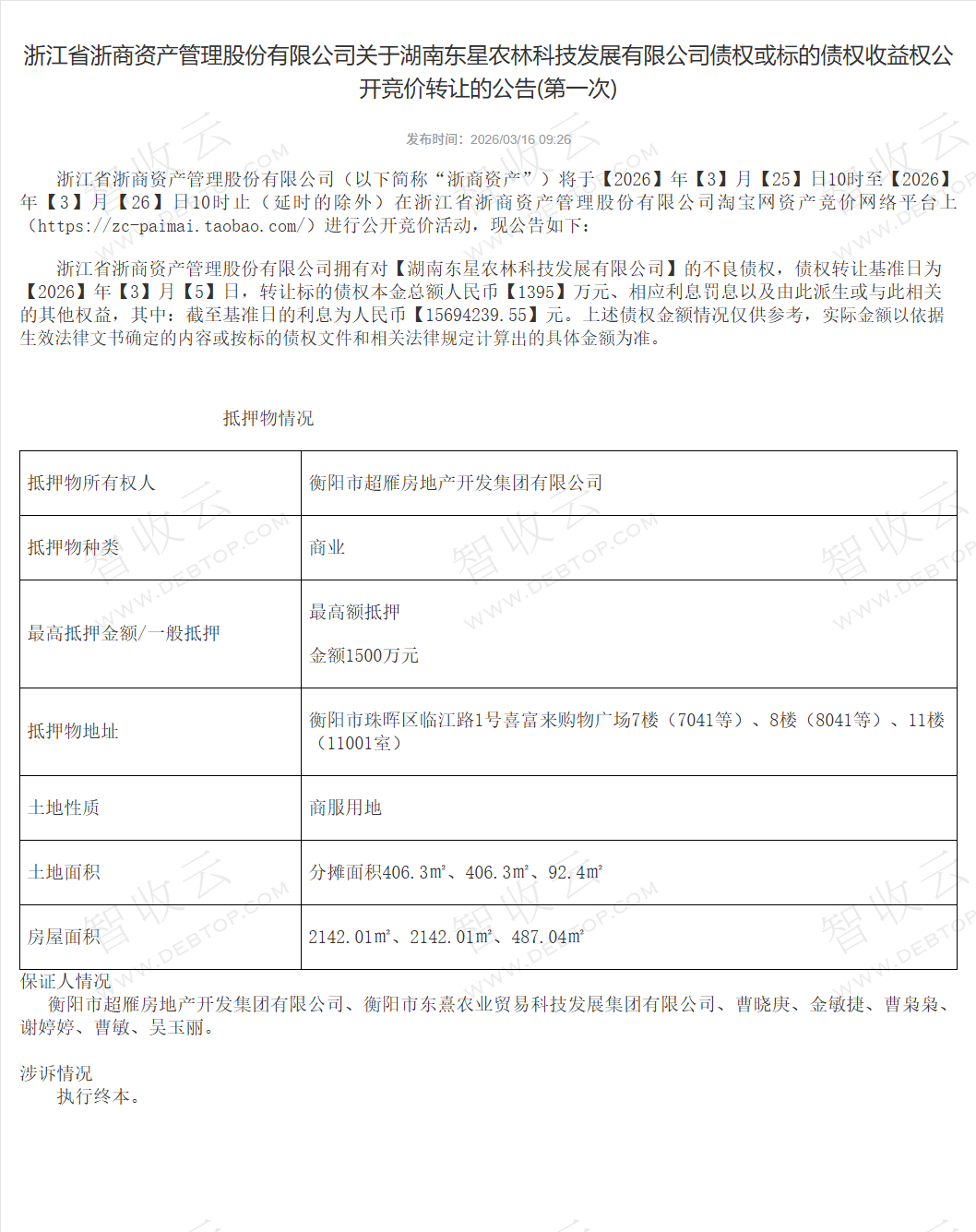湖南东星农林科技发展有限公司,衡阳市东熹农业贸易科技发展集团有限公司,浙江省浙商资产管理股份有限公司关于湖南东星农林科技发展有限公司债权或标的债权收益权公开竞价转让的公告(第一次),公告日期:2026-03-16,债权方:浙江省浙商资产管理股份有限公司,资产总额:2964.4万元。