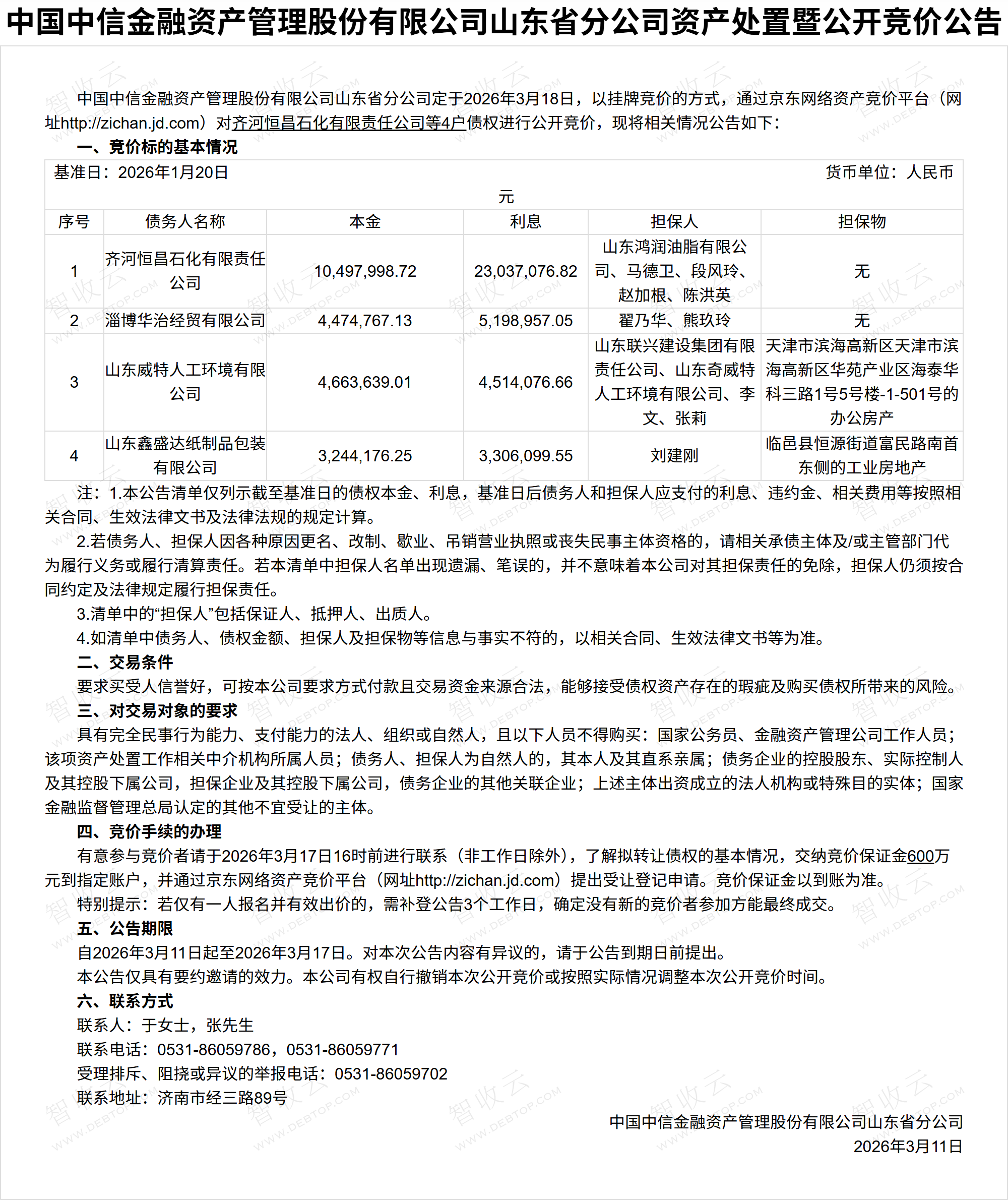 山东鑫盛达纸制品包装有限公司,淄博华治经贸有限公司,中国中信金融资产管理股份有限公司山东省分公司资产处置暨公开竞价公告,公告日期:2026-03-15,债权方:中国中信金融资产管理股份有限公司山东省分公司,资产总额:5893.7万元。