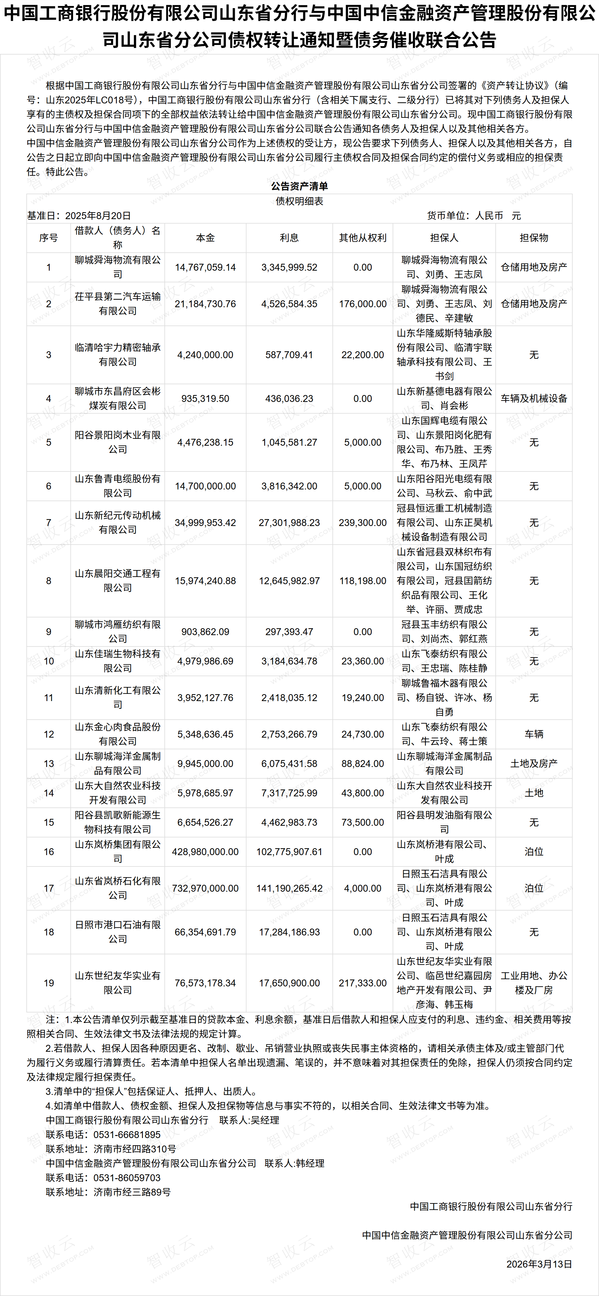 山东世纪友华实业有限公司,山东大自然农业科技开发有限公司,中国工商银行股份有限公司山东省分行与中国中信金融资产管理股份有限公司山东省分公司债权转让通知暨债务催收联合公告,公告日期:2026-03-15,转让方:中国工商银行股份有限公司山东省分行,受让方:中国中信金融资产管理股份有限公司山东省分公司,资产总额:181409.6万元。