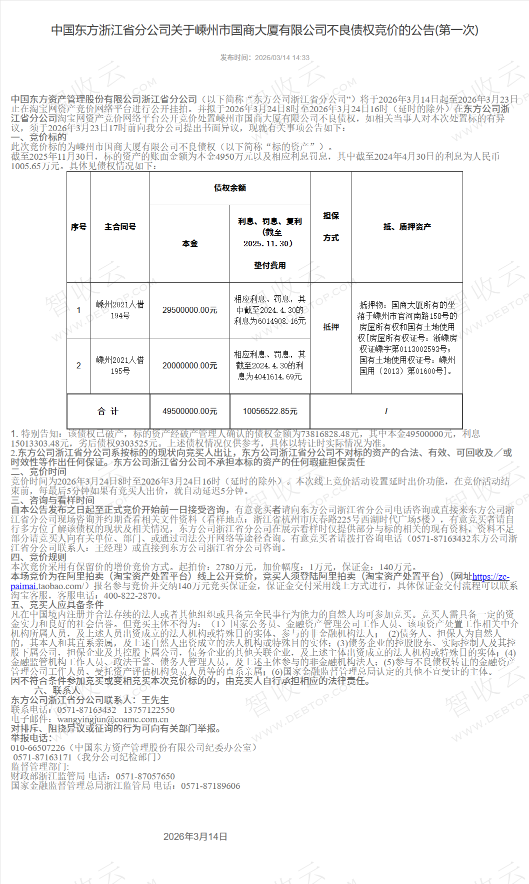 来源:中国东方浙江省分公司(阿里资产) 公告日期:2026-03-14