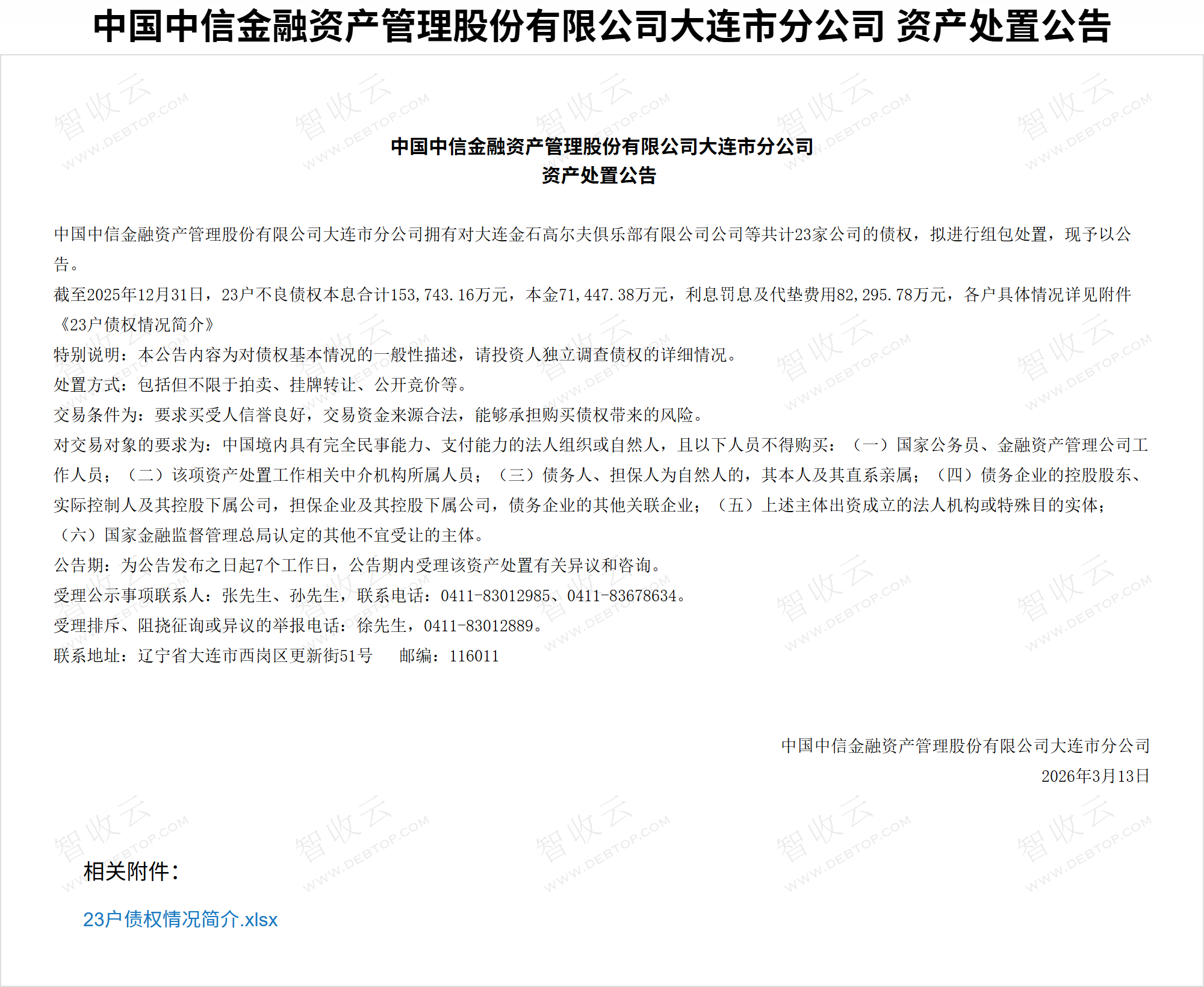 来源:中国中信金融资产大连市分公司(阿里资产) 公告日期:2026-03-13