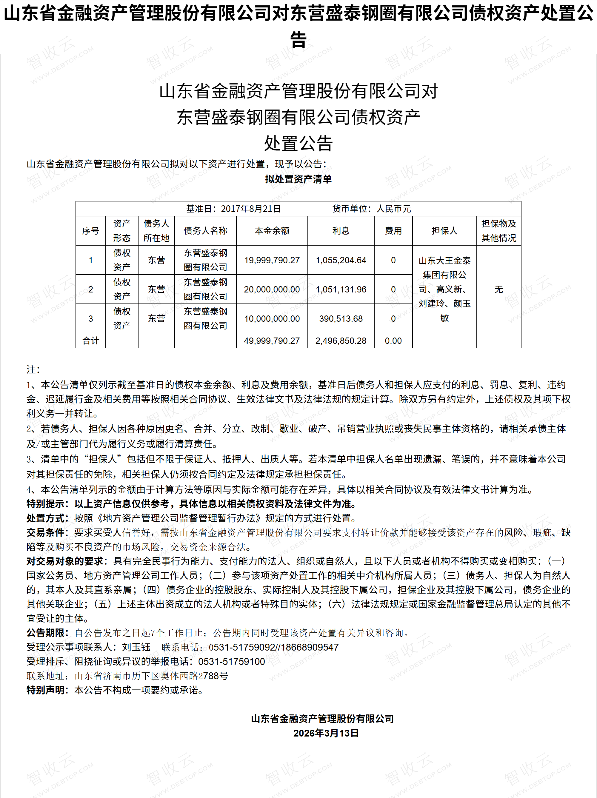 东营盛泰钢圈有限公司,山东大王金泰集团有限公司,山东省金融资产管理股份有限公司对东营盛泰钢圈有限公司债权资产处置公告,公告日期:2026-03-13,债权方:山东省金融资产管理股份有限公司,资产总额:5249.7万元。