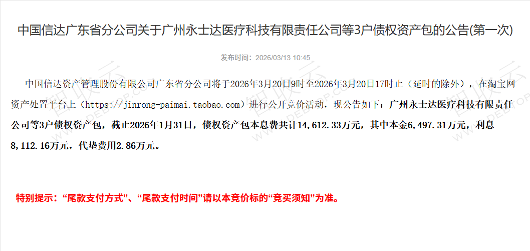 广州永士达医疗科技有限责任公司,中国信达广东省分公司关于广州永士达医疗科技有限责任公司等3户债权资产包的公告(第一次),公告日期:2026-03-13,债权方:中国信达资产管理股份有限公司广东省分公司,资产总额:14612.3万元。