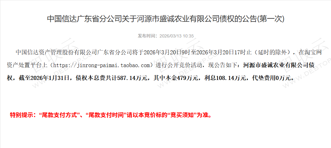 河源市盛诚农业有限公司,中国信达广东省分公司关于河源市盛诚农业有限公司债权的公告(第一次),公告日期:2026-03-13,债权方:中国信达资产管理股份有限公司广东省分公司,资产总额:587.1万元。