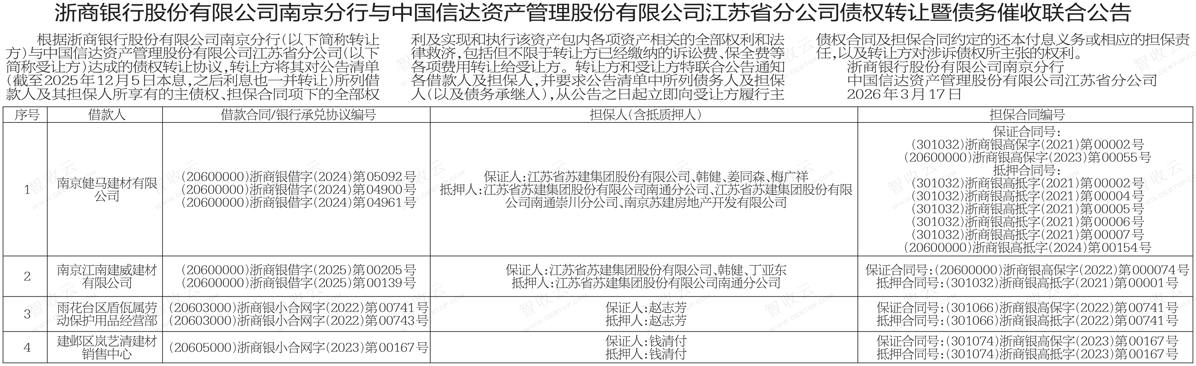南京江南建威建材有限公司,南京健马建材有限公司,浙商银行股份有限公司南京分行与中国信达资产管理股份有限公司江苏省分公司债权转让暨债务催收联合公告,公告日期:2026-03-17,转让方:浙商银行股份有限公司南京分行,受让方:中国信达资产管理股份有限公司江苏省分公司,资产总额:0.0万元。