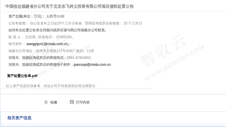 中国信达福建省分公司关于北京东飞祥义投资有限公司项目债权处置公告
