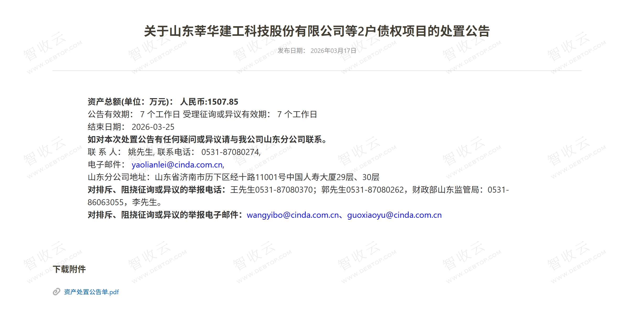 来源:中国信达资产管理股份有限公司山东省分公司(京东资产) 公告日期:2026-03-17