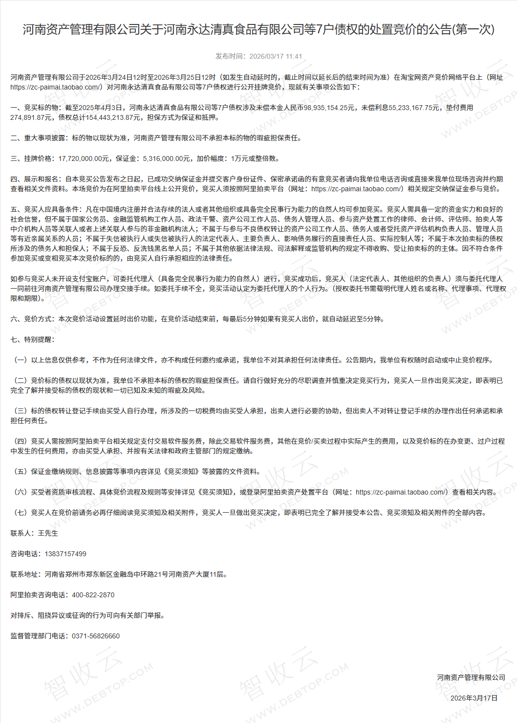 河南永达清真食品有限公司,河南资产管理有限公司关于河南永达清真食品有限公司等7户债权的处置竞价的公告(第一次),公告日期:2026-03-17,债权方:河南资产管理有限公司,资产总额:15444.3万元。