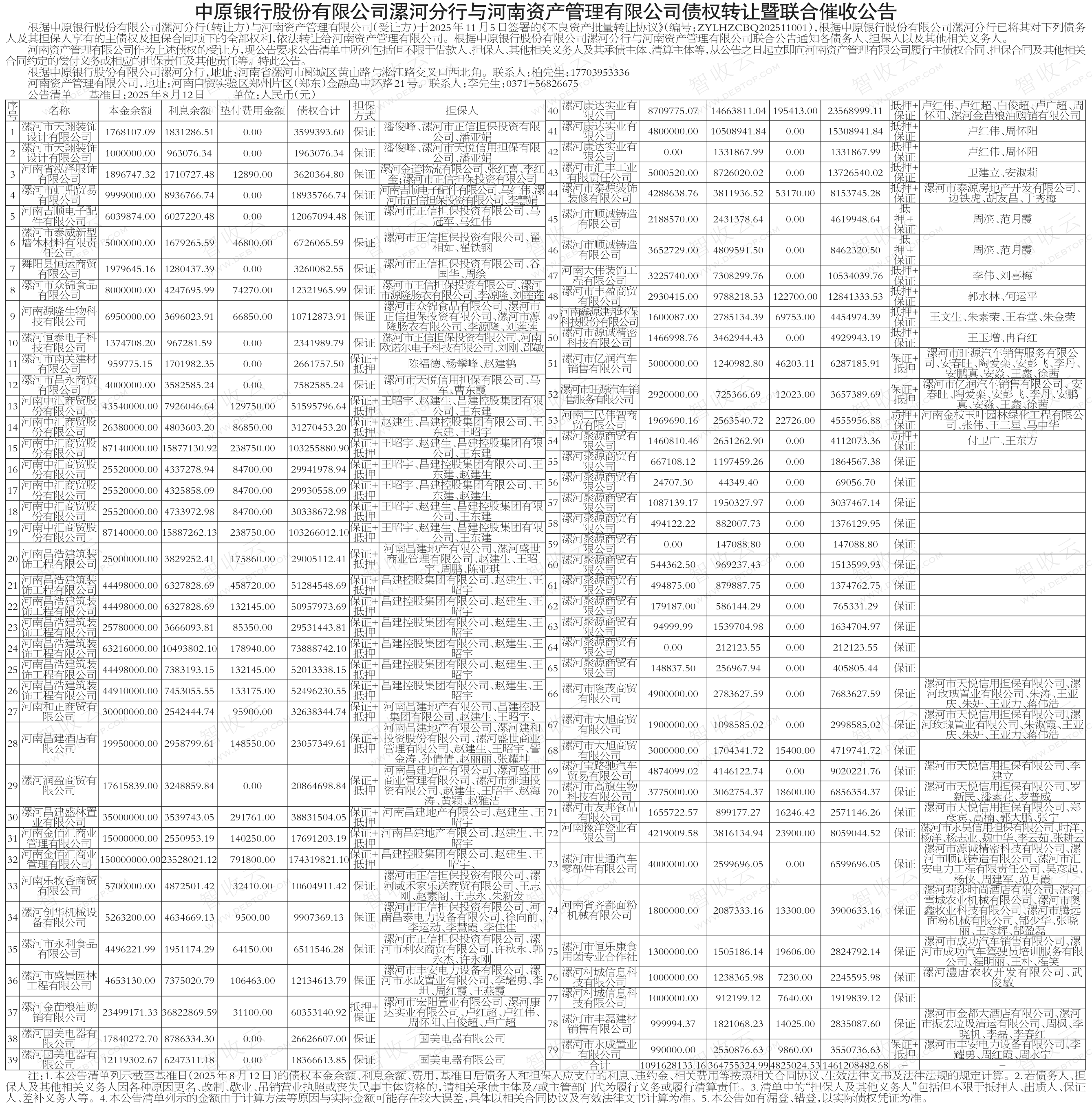 漯河创华机械设备有限公司,河南省泓泽服饰有限公司中原银行股份有限公司漯河分行与河南资产管理有限公司债权转让暨联合催收公告 银行转出