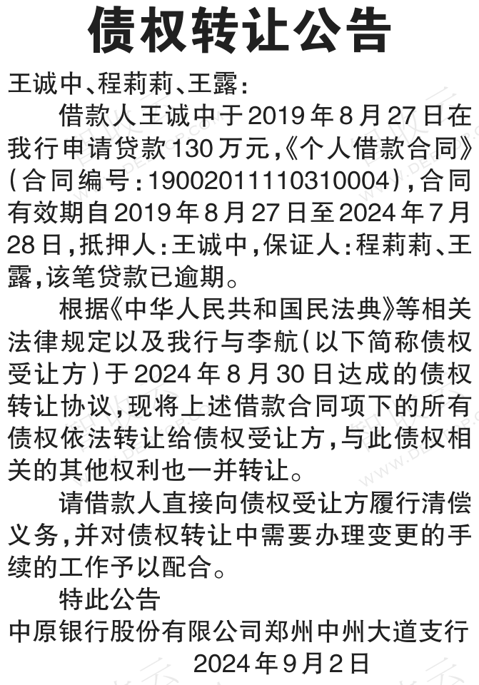 转让公告债权转让公告 银行转出,债权转让公告,公告日期:2024-09-02,转让方:中原银行股份有限公司郑州中州大道支行,受让方:李航,资产总额:130.0万元。王诚中等1户。来源:河南法制报 公告日期:2024-09-02债权金额130万债权本金130万户数1户