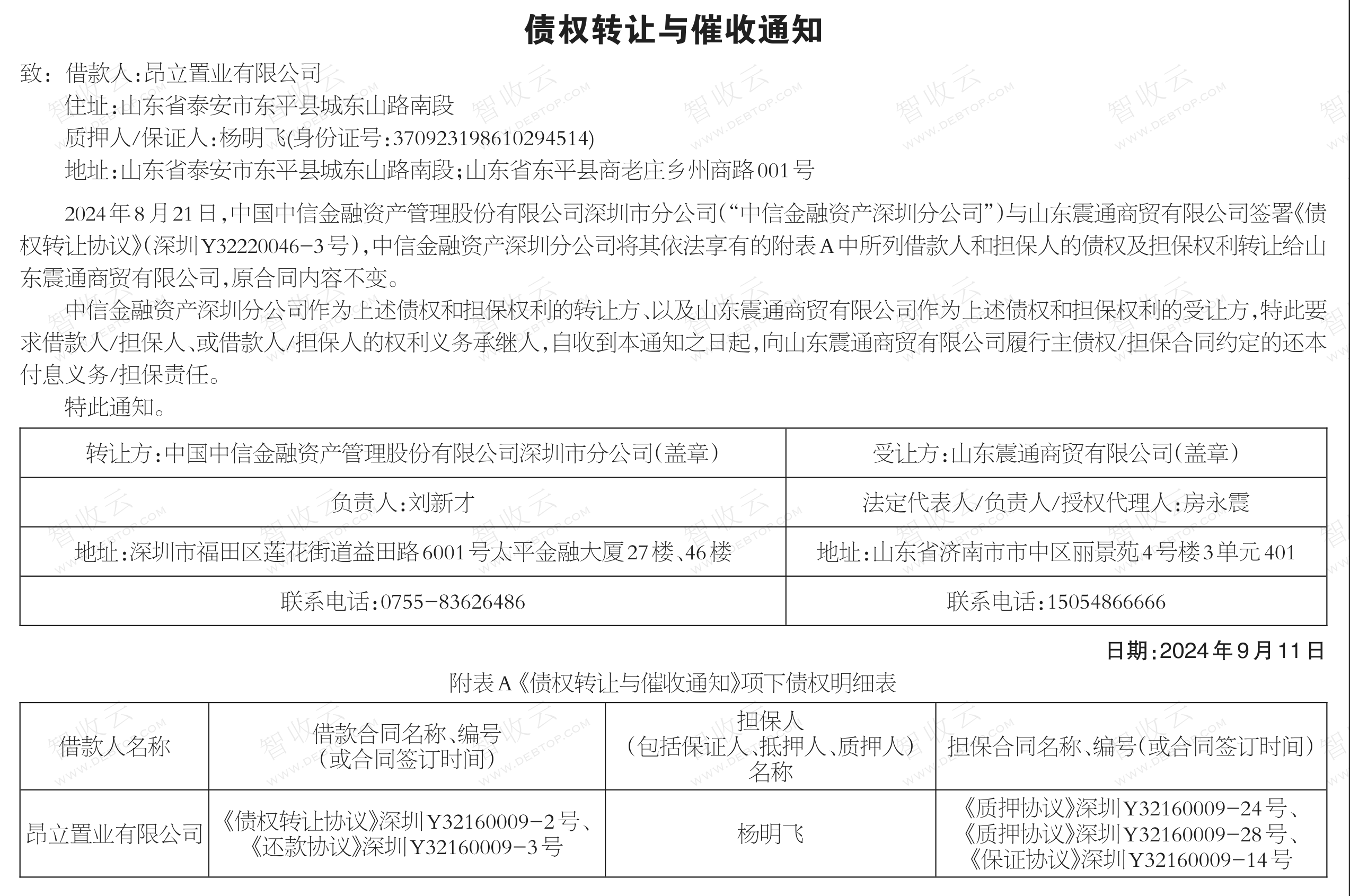 昂立置业有限公司,债权转让公告,公告日期:2024-09-11,转让方:中国中信金融资产管理股份有限公司深圳市分公司,受让方:山东震通商贸有限公司,资产总额:0.0万元。