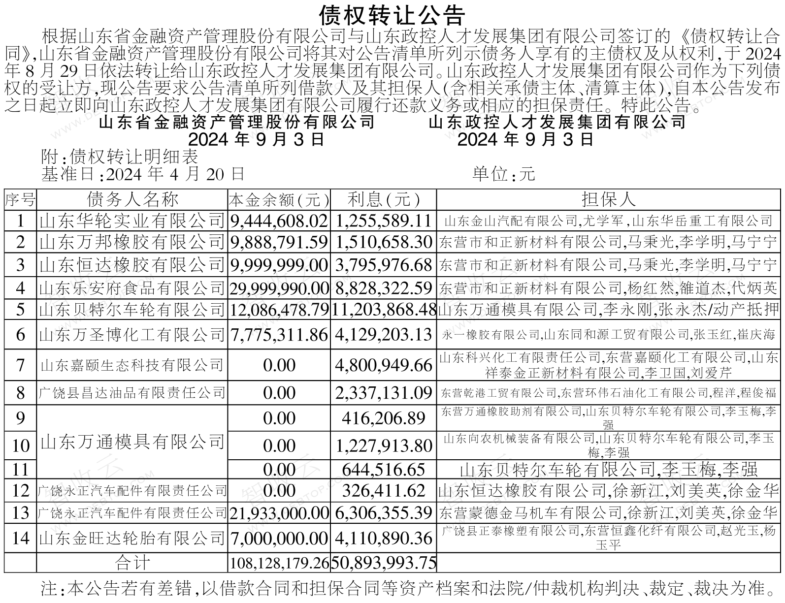 山东贝特尔车轮有限公司,山东万通模具有限公司,债权转让公告,公告日期:2024-09-03,转让方:山东省金融资产管理股份有限公司,受让方:山东政控人才发展集团有限公司,资产总额:15902.2万元。