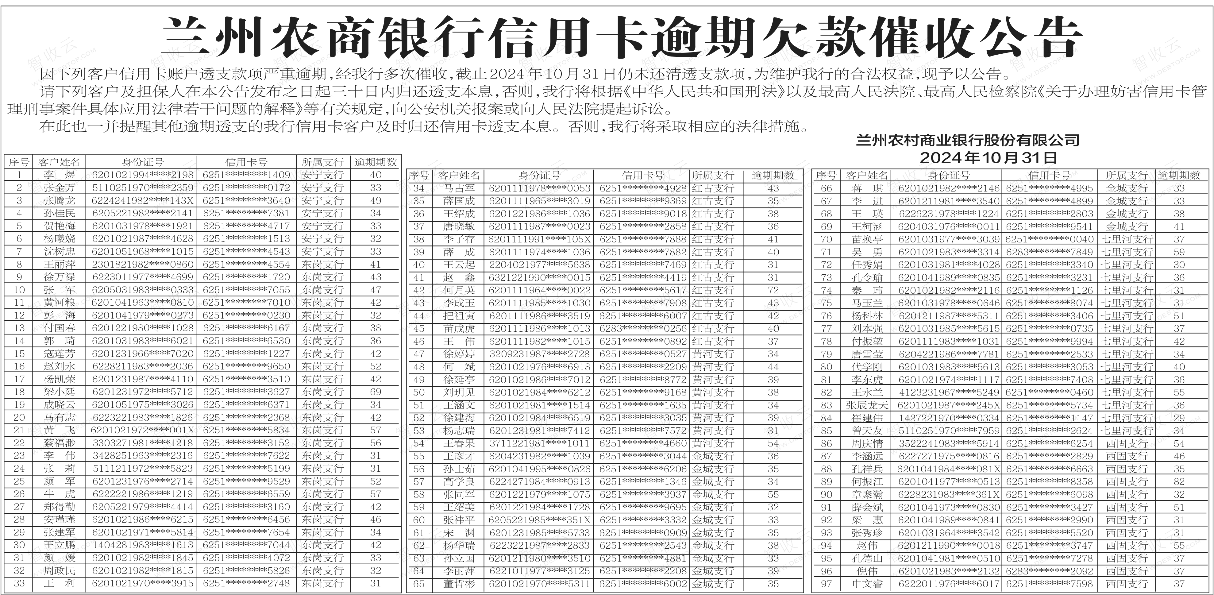 催收公告兰州农商银行信用卡逾期欠款催收公告 ,兰州农商银行信用卡逾期欠款催收公告,公告日期:2024-10-31,债权方:兰州农村商业银行股份有限公司,资产总额:0.0万元。王丽萍,张金万,徐婷婷等93户。来源:兰州晨报 公告日期:2024-10-31债权金额债权本金户数93户