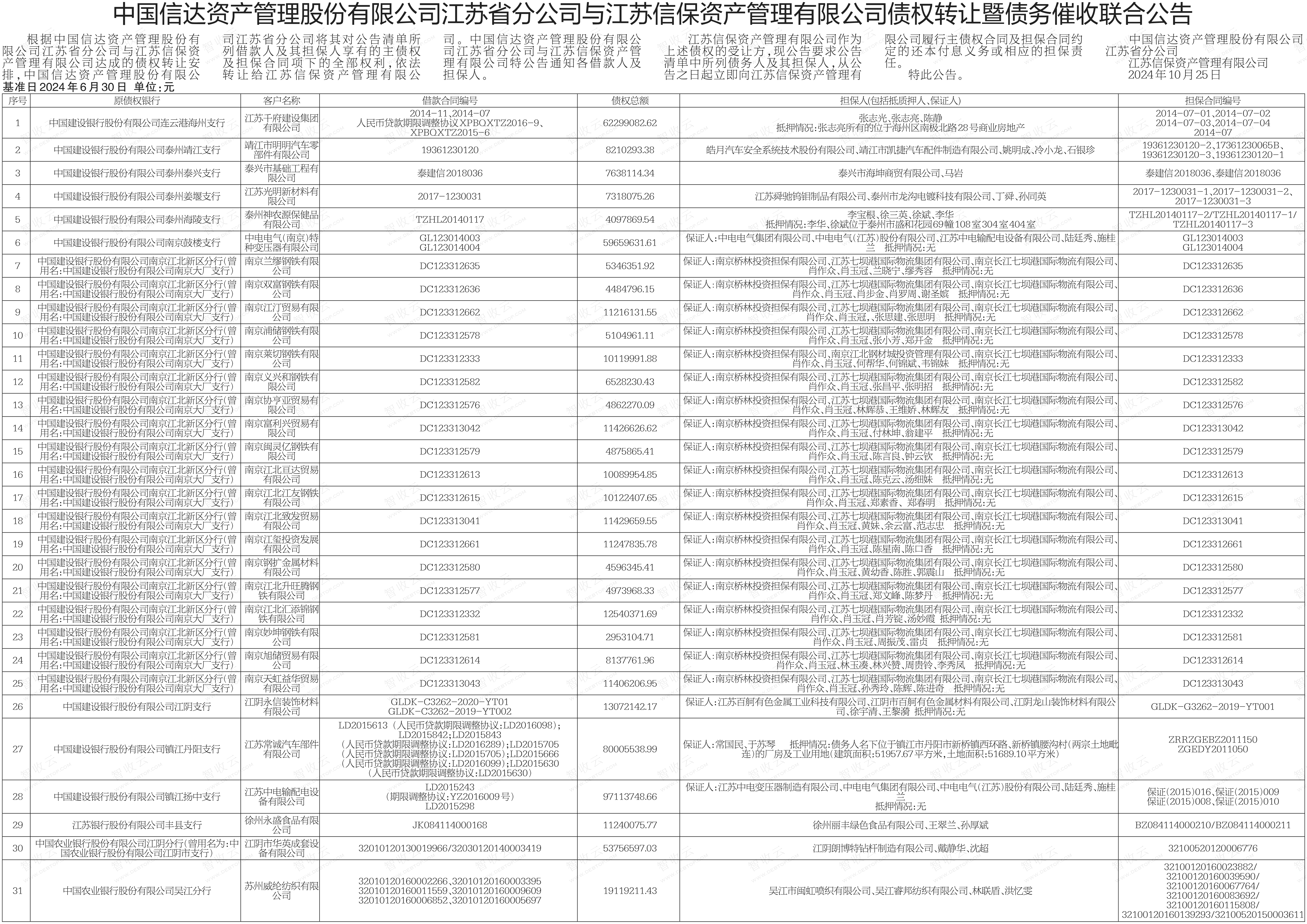 江阴市华英成套设备有限公司,苏州威纶纺织有限公司中国信达资产管理股份有限公司江苏省分公司与江苏信保资产管理有限公司债权转让暨债务催收联合公告 AMC转出