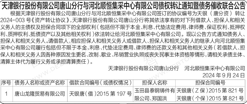 唐山龙隆贸易有限公司天津银行股份有限公司唐山分行与河北顺恒集采中心有限公司债权转让通知暨债务催收联合公告 银行转出