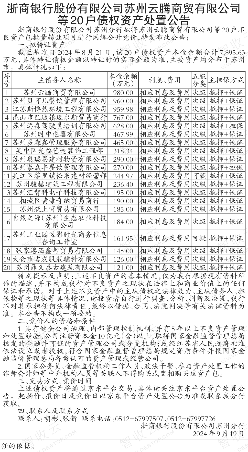 苏州云腾商贸有限公司,苏州贝可儿餐饮管理有限公司浙商银行股份有限公司苏州云腾商贸有限公司等20户债权资产处置公告