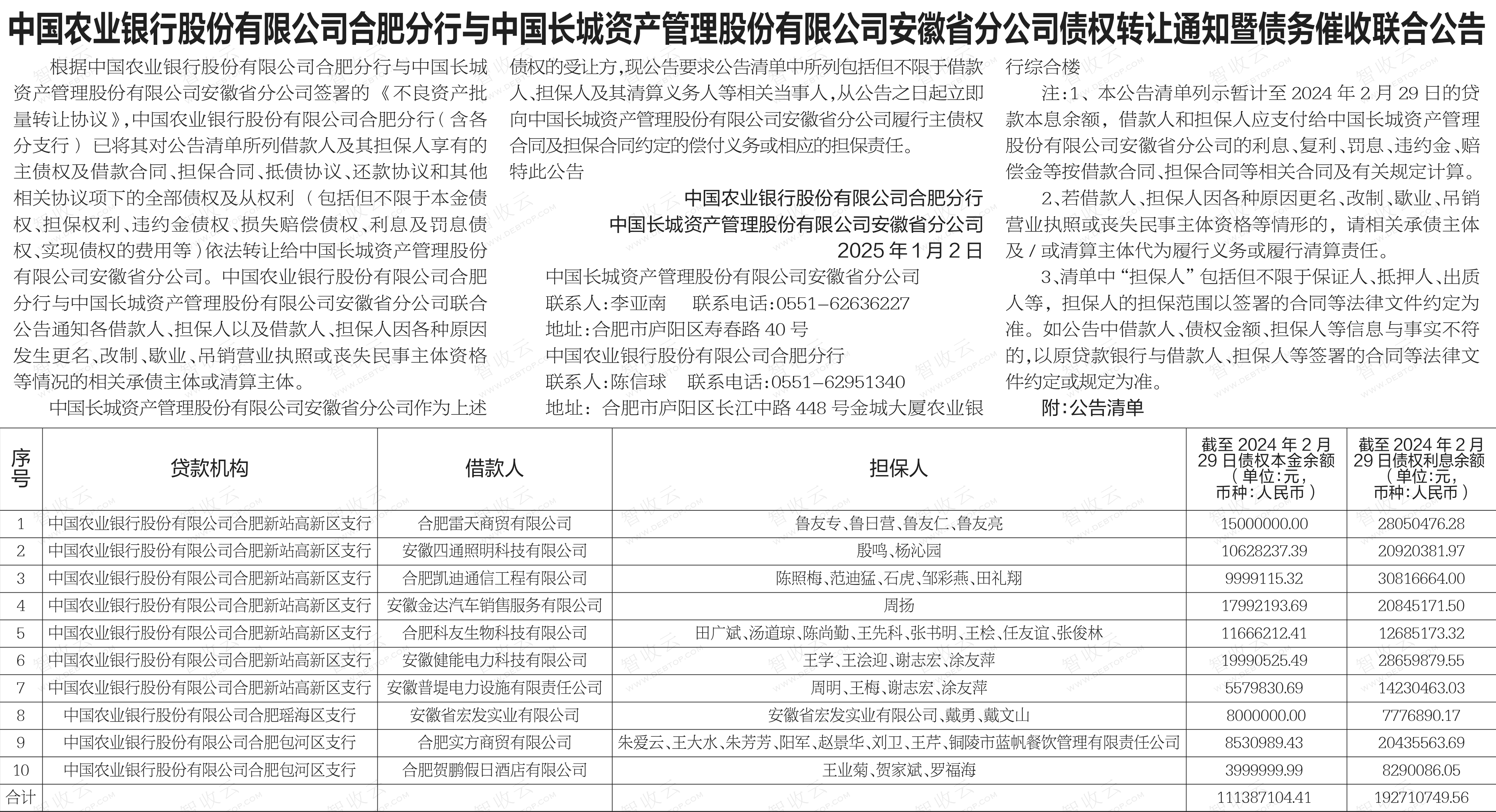 合肥雷天商贸有限公司,安徽四通照明科技有限公司中国农业银行股份有限公司合肥分行与中国长城资产管理股份有限公司安徽省分公司债权转让通知暨债务催收联合公告 银行转出