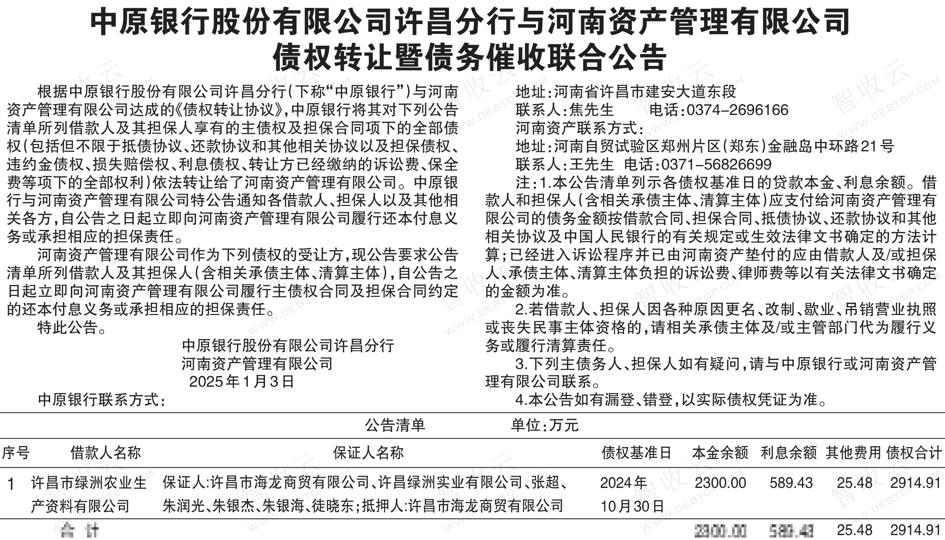 许昌市绿洲农业生产资料有限公司,许昌市海龙商贸有限公司,中原银行股份有限公司许昌分行与河南资产管理有限公司债权转让暨债务催收联合公告,公告日期:2025-01-03,转让方:中原银行股份有限公司许昌分行,受让方:河南资产管理有限公司,资产总额:2914.9万元。